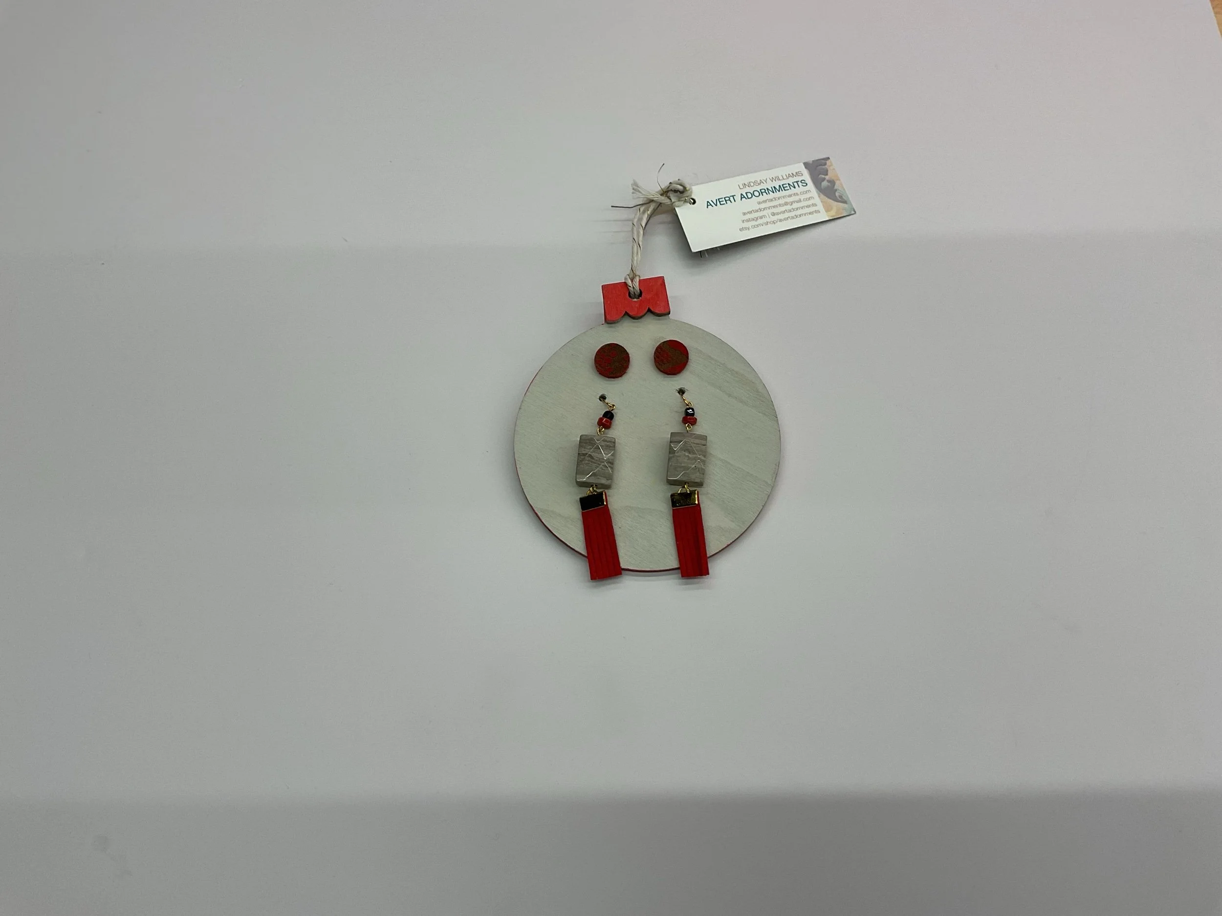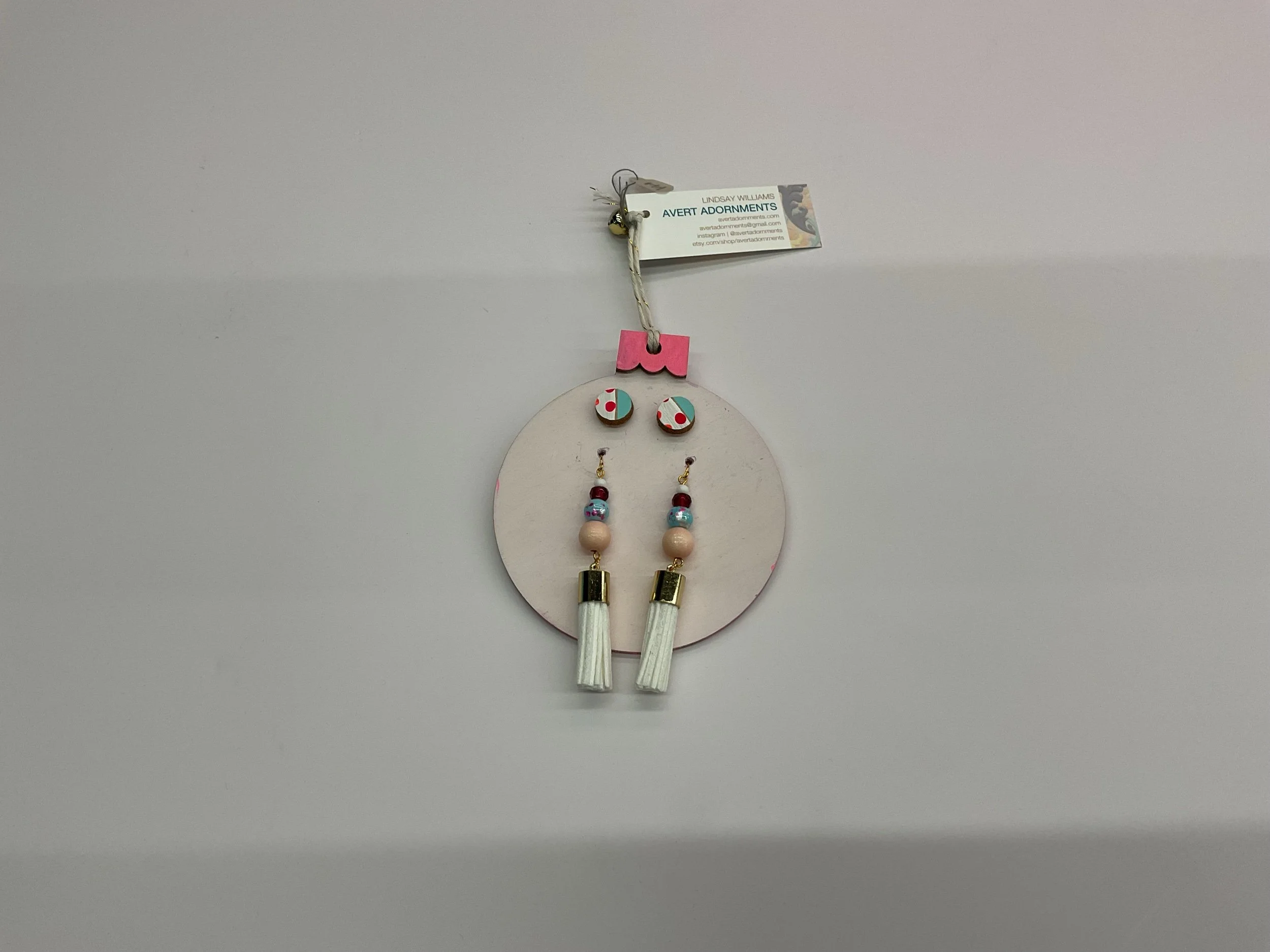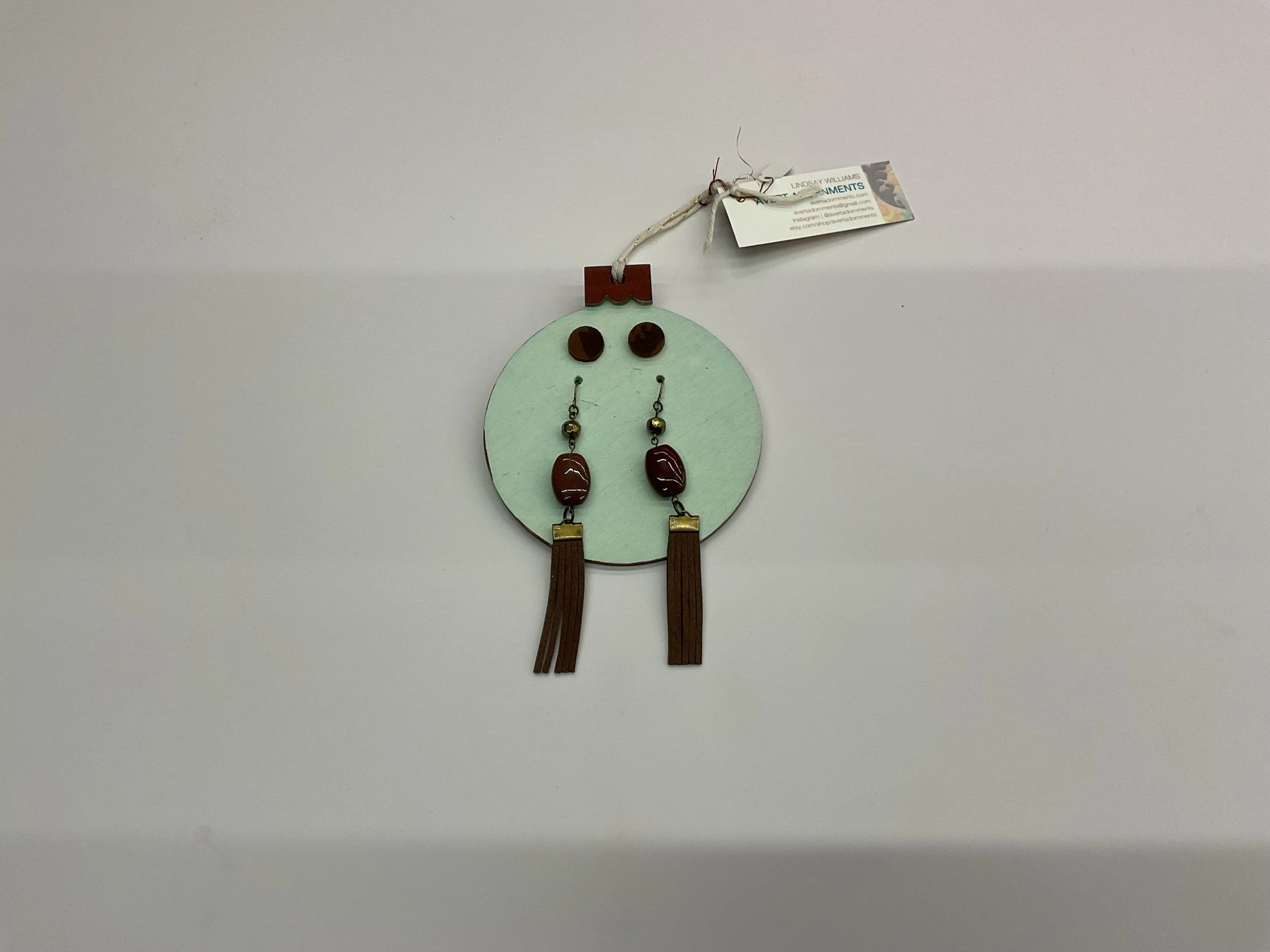22k gold plated ear wires, wood hoop, vegan suede mini tassel, enamel accent, vintage beads